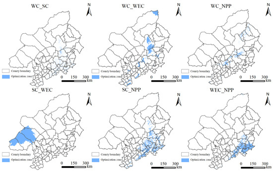 The strength of the WC_SC trade-off was highest when the land use type was forest, precipitation was maximum, and slope had low value. Optimized zones were scattered in the central part of the country. When precipitation and wind speed were in the highest interval and evapotranspiration was in the low value area, the strength of the WC_WEC trade-off relationship reached its highest level, and the optimized area showed a faceted main distribution in Keshiketeng Banner and East Ujimqin Banner. The strength of the WC_NPP trade-off relationship reached its maximum when the precipitation was high, the NDVI was in the highest range, and the temperature was moderate, and the optimized areas were concentrated in the southern part of Weichang County and the northern part of Zhangbei County in the study area. The strength of the SC_WEC trade-off relationship was highest when the wind speed was in the medium interval, the precipitation was in the minimum range, and the temperature was high; this mainly occurred in the Sonid Left Banner, Sonid Right Banner, the north-central part of Siziwang Banner, and the northern part of the Darhan Muminggan Joint Banner. The intensity of the SC_NPP trade-off was most likely to be the highest when the land use type was forested and both precipitation and NDVI were in the highest range, and this occurred mainly in the southeastern part of the study area, including the northern parts of Beijing, Chengde, and Zhangjiakou. The WEC_NPP trade-off strength was maximized when the precipitation and NDVI were the highest and the wind speed was low. The optimized area included Kuancheng and Manzu County, located in the eastern part of the Yanshan mountain water conservation area. It also included southern Pingshuan County, Chengde County, Xinglong County, Luanping County, Huairou District, Yanqing District, Changping District, and Mentougou District.