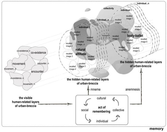 Urban-breccia situates memory and human beings at the center of knowledge theory. Because, within the phenomenological framework, the process of acquiring knowledge inherently involves the direct recall of memory contents, it is specifically termed ‘remembering’. Urban-breccia is interpreted by the individual memories through relational networks where both internal and external factors are influential. This spontaneous process of interpretation is not merely a one-dimensional formation of mental imagery derived solely from sensations. This imagery process involves the continuous reconstruction of the past images acquired through senses and experiences in the memory in the present time. This constantly recurring process contains various acts of remembering that involve specific processes and relationships. Greek philosophers distinguish between various acts of remembering using two distinct terms based on their qualities. The act of remembering that involves a sudden emergence of an image in the mind, resembling a sensation (pathos), is referred to as “mneme”. On the other hand, the active effort of consciously remembering specific information is denoted as “anamnesis” [] (p. 4).