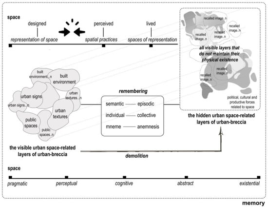 The study conceptualizes the urban-breccia concept, enabling the collective consideration of an individual’s experiential world, urban space, and the dimensions of written culture through the prism of memory. It foresees that conceptualizing this notion and exploring its embedded meaning relationships inherent in the concept will contribute to new knowledge production concerning sustainable spaces. Given its inherently complex and continuously evolving nature associated with memory, it is evident that the multidimensional facets of urban-breccia, harboring semantic–syntactic, concrete–abstract, and individual–collective characteristic dichotomies, cannot be resolved through one-dimensional assessments within a linear concept of time. Hence, in the proposed urban-breccia framework, the process of knowledge production evolves into a spatial reading that points towards the simultaneous utilization of phenomenological, syntactic, and hermeneutic analyses, rather than separately examining these three perspectives through a chronological timeline.