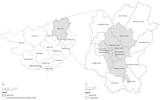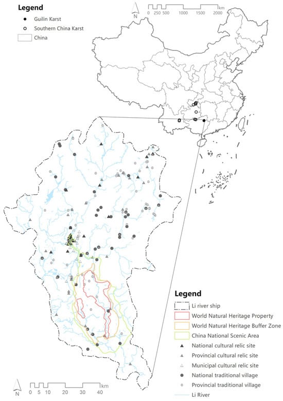 The Li River basin is located within the northeastern part of Guilin City in the Guangxi Zhuang Autonomous Region, China (Figure 2). It belongs to the Xi River system, a major tributary of the Pearl River basin. Originating from the wetlands of Maor Shan, the main peak of Yuecheng Ridge in the northwest of the Nanling Mountains, the Li River flows through Pingxiang Town in Pingle County, where it converges with the Lipu River and the Gongcheng River to form the Gui River. The basin includes 19 tributaries, such as Taohua River, Xiaodong River, Nanxi River, and Xiangsi River, with a total length of approximately 300 km and an area of about 8100 km2. The Li River basin boasts rich landscape resources, encompassing natural heritage resources with “green mountains, clear waters, unique caves, and beautiful rocks”, as well as vibrant and diverse cultural heritage resources. These elements are interdependent, influencing each other and merging to nurture unique, extraordinary, and picturesque landscapes, embodying multiple values in terms of nature, culture, society, research, and history.