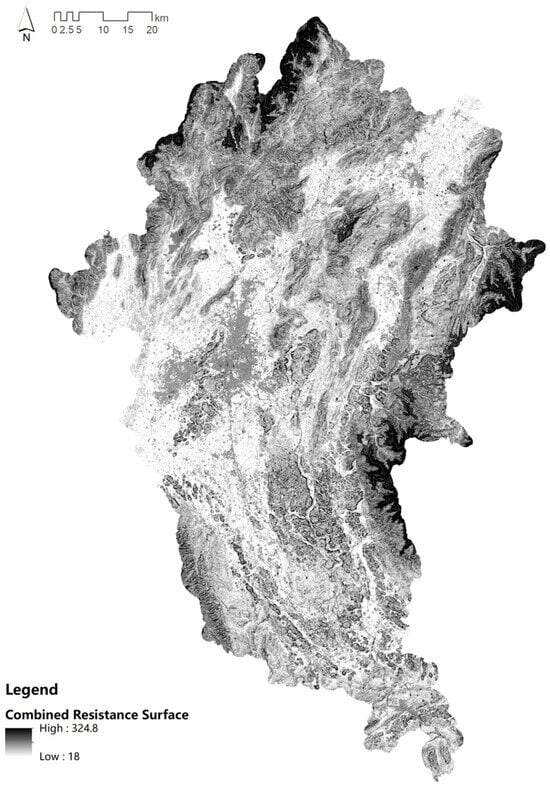 First, the resistance classification and resistance values for elevation, slope, terrain relief, and land cover were determined based on the trends in AP/NRLH values (Table 1). Regarding elevation, the decrease in AP/NRLH values with increasing elevation indicates that cultural dissemination and settlement construction gradually become more challenging with rising elevation. Similarly, in terms of slope and terrain undulation, the decrease in AP/NRLH values with increasing numerical values indicates a gradual increase in resistance to cultural influence. In terms of land cover, farmland and water bodies are crucial manifestations of human–land relationships, serving as essential links between forests and towns and being the most prevalent spatial types for rural heritage distribution. Hence, their resistance values are relatively low. Impervious surfaces represent spaces with concentrated human activities, enhancing heritage accessibility; hence, their resistance values are moderate. Spaces such as forests, shrubs, and wetlands sustain ecological habitats, resulting in a lower distribution of heritage, and consequently, higher resistance values.
