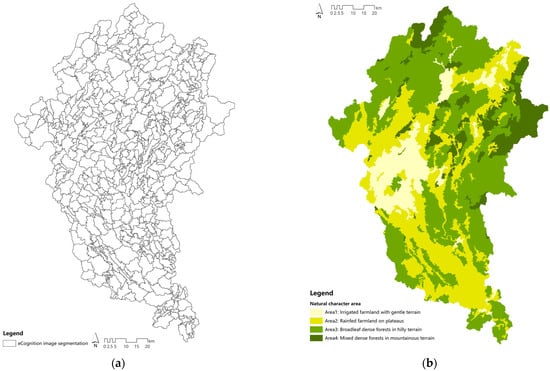 Figure 7. The process of natural character areas demarcation in the Li River Basin: (a) segmentation results using eCognition 9.0 software; (b) clustering results of natural character units.