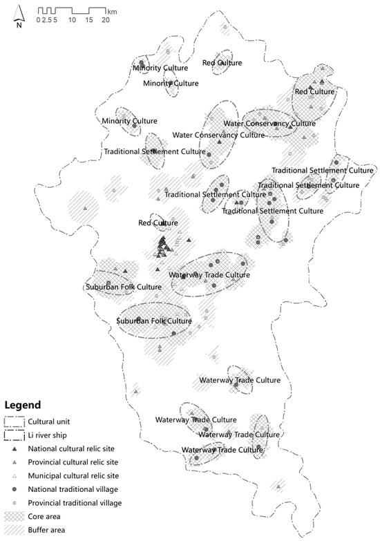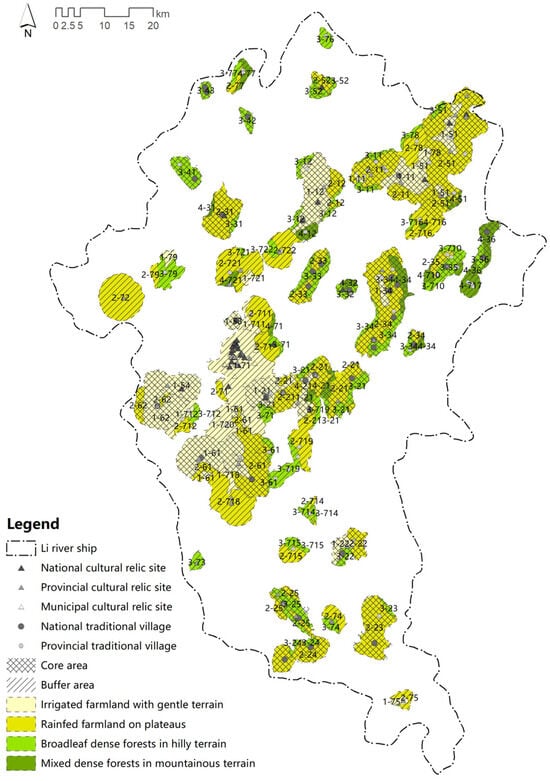 Cultural heritage units, traditional villages, and intangible cultural heritage are integral components of rural landscape heritage, collectively reflecting regional cultural characteristics. This study, based on the boundaries of cultural influence range, designates the cultural influence range of national heritage sources as the cultural core area, with the remaining area categorized as the cultural buffer zone. Based on the spatial distribution of heritage sources and cultural content, six cultural categories and forty-three cultural units are established within the cultural core area, using national landscape heritage sources as the primary reference and considering other material heritage and intangible heritage. The core area comprises six cultural categories and twenty-two cultural units, while the buffer zone, with less distinct cultural characteristics, only includes cultural units, totaling twenty-one (Table 6; Figure 9).