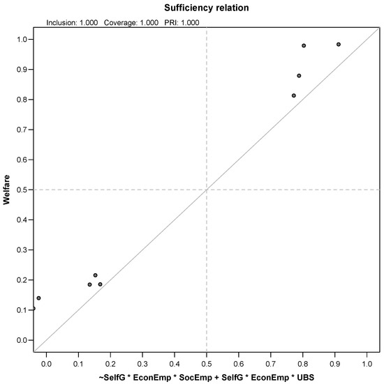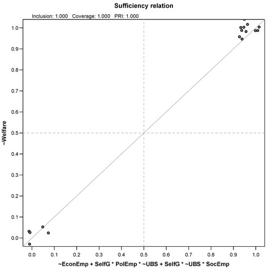 In line with the QCA for the sustainable welfare outcomes (~Welfare), we conducted a parameter of fit (pof) test to identify conditions falling under the ‘Necessary’ category. A condition qualifies as a “Necessary” condition or prerequisite if the RoN (Relevance of Necessity) is “1.000”. According to the pof test of the “Necessary” condition for negation of sustainable welfare outcomes (~Welfare), none of the five individual conditions qualify as a “Necessary” condition for achieving the negation of sustainable welfare outcomes. It implies that only a set of conditions could explain the failure of attaining sustainable welfare outcomes (~Welfare).