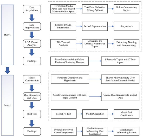 36]. This topic model is capable of uncovering abstract themes latent in massive text and yields more distinctive results compared to traditional methods such as word frequency clustering statistics. Therefore, this study, based on the LDA model, conducts topic mining on online comment data to explore the dimensions of user evaluations and focal features regarding shared micro-mobility in the post-sharing era. Building on this, a research model for user satisfaction in Chinese shared micro-mobility is established based on the ACSI, and an SEM approach is employed to establish relevant quantitative models, conducting empirical research on the authenticity and correlation of these key factors. The overall research methodology framework is illustrated in