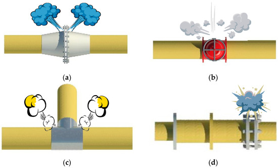 Gas leakage and diffusion at the joint of the pipeline system: (a) Flange leakage condition; (b) Valve leakage condition; (c) Leakage of connector; (d) Casing leakage condition.