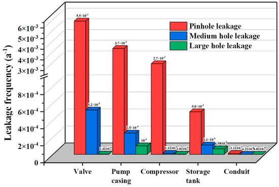 According to the process leakage frequency of the International Federation of Oil and Gas Producers and the hydrocarbon leakage statistical frequency of DNVGL [29], the probability of leakage under different leak apertures was further studied. Based on Equation (3), the probability of leakage in equipment with an unknown aperture is calculated, and the leakage situation of each equipment is judged from the perspective of a quantitative leakage risk assessment. The distribution diagram of the probability of leakage in process equipment under different aperture types is shown in Figure 2.