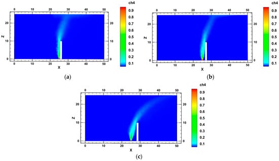 Influence of obstacle distance on leakage diffusion: (a) The gas diffusion of the obstacle 1 m away from the leakage source; (b) The gas diffusion of the obstacle 2 m away from the leak source; (c) Gas diffusion of the obstacle 4 m away from the leak source. The cloud image label is expressed as a mass fraction of methane (the same below).