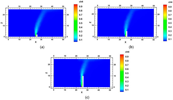 Via a comparison of Figure 3a–c, it can be found that on the windward side of the obstacle, the leakage gas continues to accumulate, and the concentration value is the largest. The higher the distance from the obstacle, the more the concentration range continues to expand. After reaching the top of the obstacle, due to the influence of wind, the closer the distance from the obstacle, the larger the angle of the leakage gas lifting and the smaller the diffusion range.