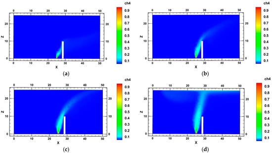 A comparison of Figure 6a–d reveals that the offset of the leaked gas decreases with an increasing leakage velocity. Under conditions of low-speed leakage, gas accumulates on the windward side of the obstacle. With an increasing leakage speed, the area of high concentration expands, spreading further over the top of the obstacle.