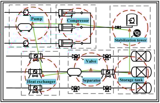 In order to adapt to the energy structure orientation of “carbon peak and carbon neutrality”, oil and gas stations have gradually turned to sustainable energy production and storage methods [1,2]. The development of natural gas and other clean energy will help protect the environment, reduce greenhouse gas emissions, and promote sustainable energy development [3]. Oil and gas stations are, through a series of process equipment and systems, able to ensure the balance of natural gas supply and demand, and to achieve the purpose of natural gas storage and management. They play an important role in ensuring the stable supply of natural gas and safe production. However, a change in the injection–production pressure and various unbalanced factors, coupled with the corrosion of the process device by the external environment and the influence of human factors on the pipe fitting equipment, can easily lead to the failure of the integrity of the oil and gas station [4]. As a kind of flammable and explosive gas, natural gas can easily cause fire and explosion accidents if there are leaks in the pipeline, storage tank and other facilities [5]. In addition, the waste of oil and gas resources and the environmental pollution caused by the leakage and diffusion of oil and gas stations pose a serious threat to sustainable development [6]. Determining how to effectively monitor the integrity of the oil and gas station and quickly locate the leakage source to reduce the expansion of leakage accidents is the focus of this research.