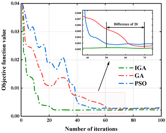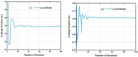 With the increase in the number of iterations, the objective function tends to converge after the 25th iteration step and reaches the theoretical optimal value 0. The positioning performance of the GA, PSO and IGA are compared under the same parameters. The simulation results and iterative convergence of the three positioning algorithms are shown in Table 6 and Figure 11. It can be seen from the error parameters that the IGA is more consistent with the real value of the leakage source in terms of location accuracy, and has a faster convergence speed.