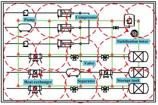 Traditional layout method: In previous studies, leakage source inversion localization based on multi-objective optimization algorithms have used an array of point placements to obtain sufficient monitoring point data. An example of a monitoring program is shown in Figure 13. However, an oil and gas station is complex and its equipment is widely distributed, which means that the requirement of a large number of equipment deployments cannot be met. On the one hand, a large number of monitoring points cannot meet the goal of refined cost management. On the other hand, the reduction in monitoring points causes insufficient data sample points, which in turn causes insufficient accuracy in the calculation of the parameters of positioning algorithms. Table 1 summarizes the advantages and disadvantages of the three types of laser methane detectors (point-type laser methane sensor, open-circuit laser methane sensor, gimbal-mounted Laser Methane Remote Sensing Instrument). The optimal layout of the monitoring points of the point-type laser methane sensor is the focus of this research. Previous studies have prioritized the deployment of points based on the probability of leakage risk as a weighting scheme, which did not fully utilize the effective monitoring range of the equipment and made it difficult to achieve the full coverage of oil and gas stations.