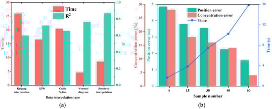 The gas leakage inversion positioning model based on the multi-objective optimization algorithm needs to provide sufficient sample points, so it is necessary to ensure the accuracy of the monitoring points and data interpolation points. The detection accuracy of the point laser methane detector can reach 1 ppm, providing accurate monitoring point concentration data. In this study, the data interpolation method based on data fusion can provide more efficient and accurate gas leakage monitoring data interpolation. As shown in Figure 14a, by comparing the computational efficiency and data error, it can be seen that comprehensive interpolation can obtain interpolation more efficiently and reduce data error. Based on the known monitoring points and data interpolation points provided, abundant and accurate sample points are provided, and the accuracy of leakage source calculation is improved. The accuracy error of the number of sample points on the leakage location and leakage concentration is shown in Figure 14b. It can be seen that, as the sample points increase, the simulation time increases relatively, and the leakage point position error decreases continuously.