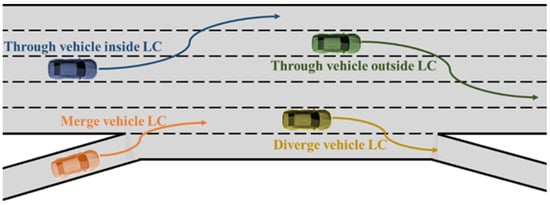 In this study, we used the definition of the LC process suggested by [45] to determine its beginning and ending points. As shown in Figure 3, points A and B, which are 1/4 lane width away from the lane marking, are respectively set as the beginning and ending points of the LC process. Thus, the anticipation process refers to the process of the LCV moving from A to C, while the relaxation process indicates the process of the LCV moving from C to B. The surrounding vehicles (SVs) of an LCV in the original and target lanes are illustrated in Figure 4. The lead and lag vehicles in the original lane before the LCV reaching the LCP are named as LeadB and LagB, respectively, while those in the target lane after the LCV passes through the LCP are named as LeadA and LagA, respectively. In addition, the trajectory data were collected at a ramp-weave weaving segment; see Figure 5. To better represent the LC characteristics, we classified the LC maneuvers into four types according to the origin–destination and LC direction of the LCV, namely, merge vehicle LC, diverge vehicle LC, through vehicle inside LC, and through vehicle outside LC, as shown in Figure 5.
