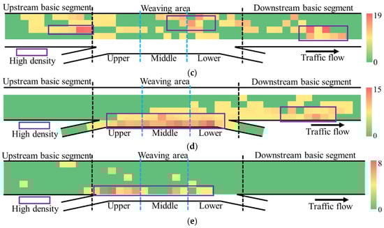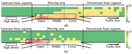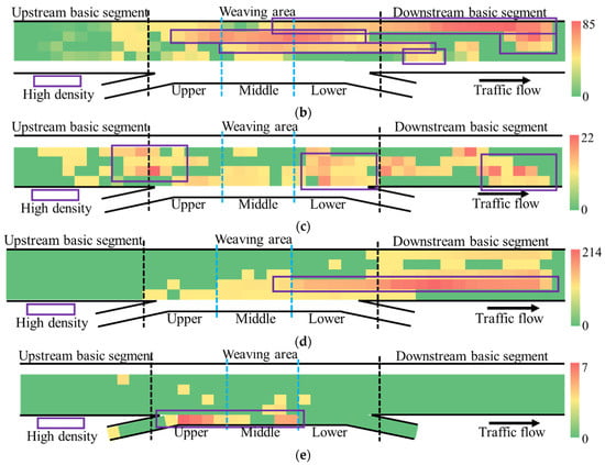 The areas highlighted by the purple rectangles in Figure 8d,e match the ones with high LC frequency in Figure 8a. In Figure 8d, most merging vehicles enter the mainline, i.e., changing lanes from No. 6 to No. 5, in the upper section of the weaving area. Additionally, many of them continue to change lanes to the middle lanes, resulting in the yellow fan-shaped area from the middle to the lower section of the weaving area in Figure 8d. This phenomenon is consistent with that of [52]. The number of diverging vehicles in the dataset is small. As can be seen in Figure 8e, most of them were already on the inside lane when reaching the weaving area, so they moved to the auxiliary lane as soon as they entered the weaving area. In both cases, there were no LC events on the inside lane. Furthermore, from the maximum value of the color bars in Figure 8b–e, the LC events made by weaving vehicles are concentrated in one area, the entrance of the on-ramp. Those made by non-weaving vehicles are dispersed within the whole study area.