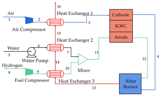 The proposed integrated system proposed mainly comprises an SOFC stack, an air compressor, an afterburner, a fuel compressor, a water pump, a mixer, and three heat exchangers, as shown in Figure 1. The SOFC operating pressure is standard atmospheric pressure. The SOFC system’s operational process is as follows.