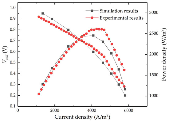 This paper validates the model using experimental data from the literature. The geometric parameters, material characteristics, fuel characteristics, and SOFC model operating conditions used in this paper are consistent with those in the references [25,26]. Figure 3 compares the simulated current–voltage curve with the experimental current–voltage curve. There is a discrepancy in the results of the comparison, and this discrepancy is due to the fact that there is still a gap between the ideal environment of the model setup and the actual experimental conditions. Generally speaking, the error will be larger in the high-current-density region, which is caused by the temperature difference resulting from ohmic heating during the experiment. This pertains to a general trend and does not impact the accuracy of our results. Therefore, the established SOFC model meets the actual operational needs of SOFCs.