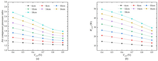 (a) Effect of flow channel length and cell voltage on the pressure ratio of the air compressor; (b) effect of flow channel length and cell voltage on the power of the air compressor.