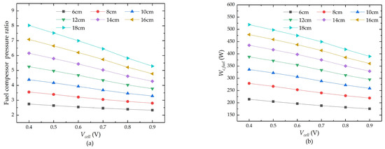 (a) Effect of flow channel length and cell voltage on the pressure ratio of the fuel compressor; (b) effect of flow channel length and cell voltage on the power of the fuel compressor.