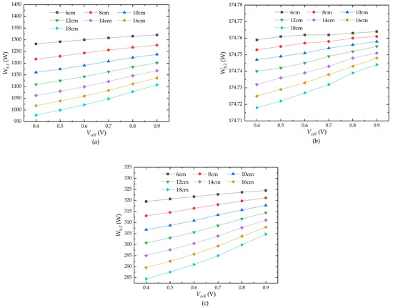 (a) Effect of flow channel length and cell voltage on the power of the air heat exchanger; (b) Effect of flow channel length and cell voltage on the power of the water heat exchanger; (c) effect of flow channel length and cell voltage on the power of the hydrogen heat exchanger.