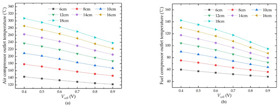 From the curve, it can be observed that there is an inverse relationship between the power consumption of each heat exchanger and the flow channel length at the same operating voltage. The reason for this is that the longer the flow channel length in an integrated system, the more work is required by the compressor to compress the fuel and air. Therefore, the fuel and air attain higher enthalpy values and temperatures at the compressor outlet. The relationship between the outlet temperature, various flow channel lengths, and the operating voltages of the gas and air compressors is illustrated in Figure 10. Therefore, the energy needed to heat the fuel gas and air to 800 °C decreases, resulting in a reduction in power consumption for the heat exchanger. Additionally, Figure 9b shows that the power consumption of the water heat exchanger is minimally influenced by the length and voltage of the cell. This is because when water is pressurized by the water pump at 25 °C, the increase in enthalpy and temperature is minimal. As a result, there is little difference in the energy required for the water to be heated to 800 °C after passing through the heat exchanger.
