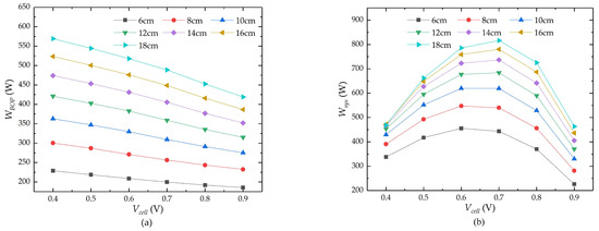 (a) Effect of flow channel length and cell voltage on BOP power consumption; (b) effect of flow channel length and cell voltage on net electrical power.