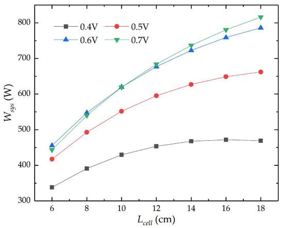 According to Figure 11, we can further determine the correlation between the flow channel length and the system’s net electrical power, as shown in Figure 12. At 0.4 V, the overall system power exhibits a rising and then falling trend. The maximum net electrical power is 471.84 W when the length is 16 cm, with a fuel utilization rate of 88.93%. This means that a longer flow channel length does not necessarily result in a better performance. Furthermore, it can be inferred that there is an optimal length value that maximizes the system’s net electrical power at various voltages.