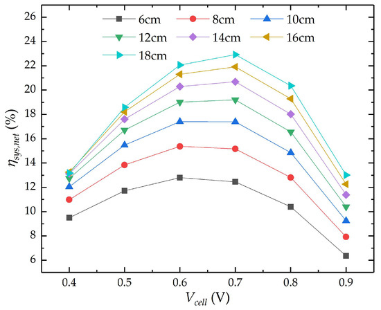 Similarly, the changing trend of the system’s net electrical efficiency with flow channel length is further illustrated in Figure 14. At 0.4 V, the net electrical efficiency shows an increasing trend with the increase in flow channel length, followed by a decrease. At a length of 16 cm, the maximum net electrical efficiency is 13.25%. It can be inferred that there is an optimal length value for different voltages that maximizes the net electrical efficiency of the system.