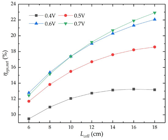 Effect of flow channel length and cell voltage on net electrical efficiency.