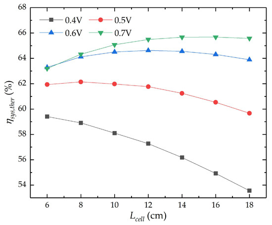 In Figure 15, it can be observed that 0.6 V and 0.7 V are close to the optimal operating voltage. With the increase in flow channel length, the system thermoelectric efficiency tends to increase and then decrease. However, the optimal length of a single battery corresponding to the highest thermal efficiency varies at different battery voltages. At 0.6 V, the thermoelectric efficiency of the integrated system is highest when the length is 12 cm, reaching 64.62%. At 0.7 V, the system thermoelectric efficiency is highest when the length is 16 cm, reaching 65.68%. Additionally, the fuel utilization rate is 65.93%, which aligns with the practical engineering situation of SOFCs. At this point, the system’s net electrical power output is 816.19 W. This is because, as the flow channel length increases, the fuel utilization rate of the SOFC also increases, thereby increasing the SOFC output power. Although the energy in the SOFC exhaust gas decreases at this point, there is still a significant amount of energy available to meet the requirements for fuel and air preheating. Longer stacks require higher air and fuel pressure at the inlet, which inevitably increases the compressor power consumption. As a result, the heat transfer power of the heat exchanger is reduced, leading to a decrease in the energy-utilization efficiency of the exhaust gas. Therefore, there is an optimal length at different voltages that maximizes the system’s thermoelectric efficiency.