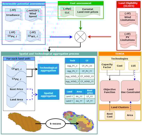 In this paper, two macro-categories of data are used, namely, simple spatial data and spatiotemporal time series. Spatial data are represented as a list of numbers using a particular coordinate system. For example, the objects of an electronic map are represented using spatial data (roads, buildings, windspeed by location), represented as points and shapes with a specified position. In this analysis, spatial data are both the constraints used to perform the land eligibility analysis and, in general, all the spatial properties that are fixed during time (e.g., cost of land rent). The superimposition of the different thematic layers (e.g., administrative, or physical constraints) allows for the draw of the final land eligibility map. These kinds of data are fixed among all the scenario periods; therefore, they are applied once and do not change over time. On the contrary, spatiotemporal time series, related to the resource potential for both photovoltaic and wind, is time dependent. A georeferenced time series keeps the whole history of the evolving object over a period [66]. Typical examples include the monitoring of crop health over years [67] and meteorological time-series [68].