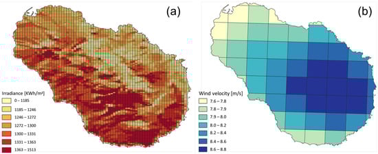 Visualization of Pantelleria island’s energy availability. (a) Annual global irradiance; (b) wind mean velocity.