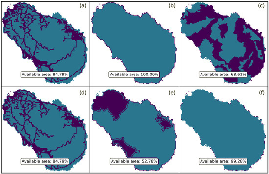 Land eligibility analysis for Pantelleria Island. (a–c) represent the constraint for photovoltaic installations while (d–f) are the ones for wind. (a,d) are anthropic exclusion. (b,e) are constant due to natural habitat and landscape heritage laws. (c,f) represent limitations associated with environmental reasons. Dark blue represents unavailable areas.