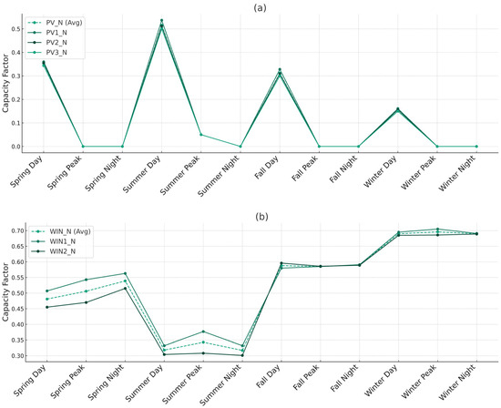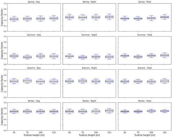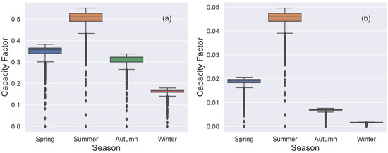 Another remarkable hypothesis is related to the division between day and peak production. As specified above, within a season, a day might have various times of interest. For instance, the peak electrical load might occur at midday in the summer, and a secondary peak might happen in the evening. This division should be accounted for when evaluating the photovoltaic potential since the mismatch between producibility potential and demand is one of the main problems with VRESs [105]. Seasonal daily and peak capacity factors under the assumption described are reported in Figure 4.