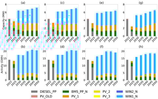 The Pantelleria energy system is subdivided into five sectors (three demand-side sectors and two supply-side sectors) [65]. The demand-side sectors are buildings (including the agriculture, commercial, and residential sectors), transport, and commercial. The supply-side sectors are the power sector and the upstream sector. Each sector includes a set of technologies, characterized by several techno-economic parameters, used to produce all the commodities necessary to ensure the production of the required final energy service demands. The upstream sector includes fossil fuel import and internal production of biomass, as well as a fictitious commodity representing renewable energy. The output commodities of the upstream sector (along with fuel imports) are inputs for the power sector and the demand-side sectors.