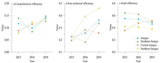 High-value areas with pure technological efficiency have always maintained a high level in southern Jiangsu, especially in the Suzhou–Wuxi–Changzhou region, forming clusters. During the period from 2013 to 2019, the growth rate of pure technological efficiency in northern Jiangsu was relatively fast, and the growth rate and trend were significantly stronger than those in other regions. This growth has been facilitated by the active adoption of new technologies, assimilation of advanced management experiences, emphasis on talent cultivation and introduction, a more relaxed development environment, and more precise policy support. These factors collectively have enabled tourist resorts in northern Jiangsu to maintain a high rate of development in recent years. The distinct regional patterns in pure technological efficiency underscore the dynamic nature of tourism development in response to economic, technological, and policy factors in different regions of Jiangsu Province.