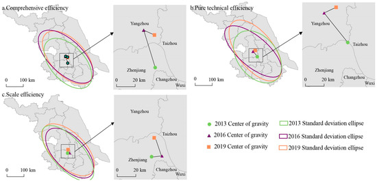In terms of scale efficiency, it can be seen that the corner θ of the standard deviation ellipse of scale efficiency decreased from 143.18° in 2013 to 141.35° in 2019. The Y-axis direction of the standard deviation ellipse of scale efficiency, the standard deviation of the main axis decreased from 222.7 km in 2013 to 208.38 km in 2019. Conversely, the direction of the X-axis of the scale efficiency standard deviation ellipse increased from 95.38 km in 2013 to 105.53 km in 2019. The scale efficiency of tourist resorts in Jiangsu Province primarily varies between 119°44′ E and 119°50′ E and 32°16′ N and 32°60′ N, forming an overall reverse L-shaped distribution (Figure 4c). The approximate location is in the eastern part of Zhenjiang. Analyzing the movement trajectory of the gravity center, it is evident that the scale efficiency center of gravity is generally shifting northeastward, with movement distances of 11.15 km and 23.86 km, respectively (Table S3), and the migration speed is gradually accelerating.