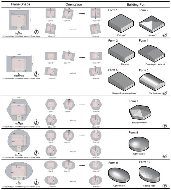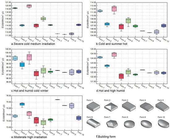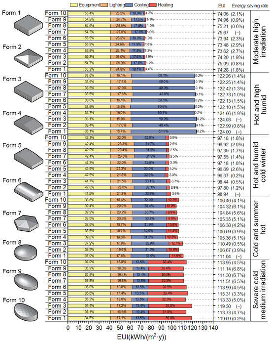 - According to Section 3.1.1, changing the building orientation can reduce the EUI in the five climate zones by 0.5–2.5%. However, as stated in Section 3.1.2, changing the building form can further increase the reduction in EUI to 1.9–6.4%, indicating that the influence of the gymnasium building form on EUI is greater than that of orientation. Elliptical floor plans with convex roofs are suitable for severe cold medium irradiation and cold and summer hot climate zones, rectangular floor plans with double-slope roofs are suitable for hot and humid cold winter and hot and high humid climate zones. and rectangular floor plans with single-slope curved roofs are suitable for moderate high irradiation climate zones with less climate variation.