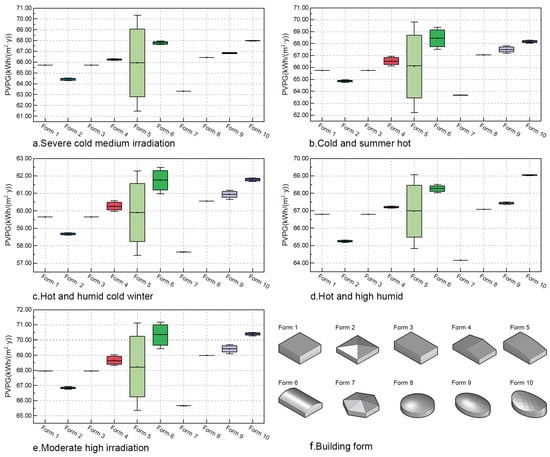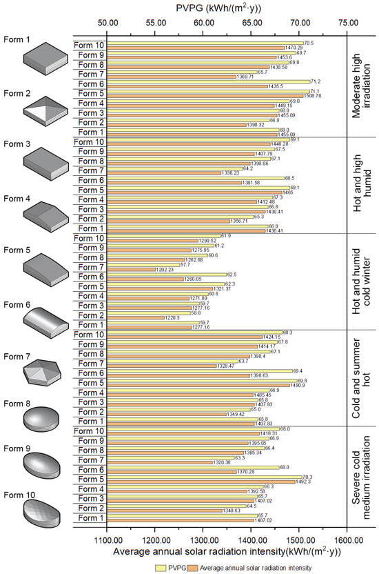 - According to Section 3.2.1, the PVPG of gymnasiums with single-slope roofs is highly sensitive to changes in building orientation, with variations ranging from 6.5% to 14.4%, which is significantly higher than the 0–2.5% for symmetrical roofs. According to Section 3.2.2, when the building form was changed, the maximum increase in PVPG for the five climate zones ranged from 7.6% to 11.1%. Rectangular floor plans with single-slope roofs and elliptical floor plans with saddle roofs are more suitable for BIPV.