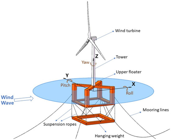 The semi-spar floating platform proposed in the present study comprises an upper floater, a hanging weight, and several suspension ropes. The upper floater is a semisubmersible buoy that provides sufficient buoyancy. The hanging weight that lowers the center of gravity, on the other hand, is suspended below the upper floater through 12 suspension ropes. Figure 2 illustrates the structural configuration of the proposed floating foundation.