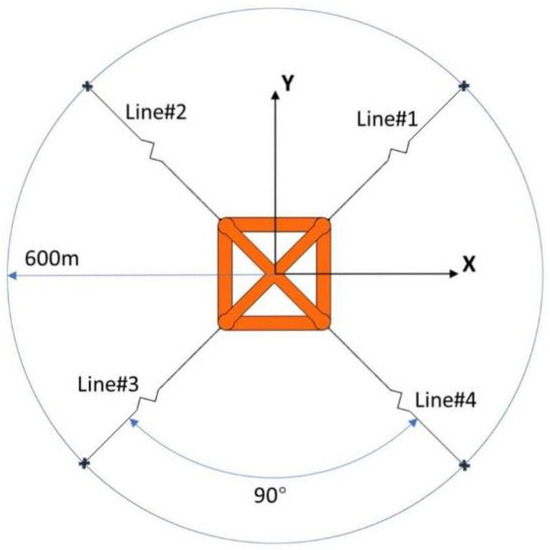 Four identical centenary mooring lines are used to moor the floating platform. The fairleads are fixed at the side columns of the upper floater, 8 m beneath the water. The anchors are assumed to be located at 150 m deep (seabed) and keep 600 m distance from the central axis. Figure 4 shows the layout of the mooring system, in which the four mooring lines are spread out symmetrically from the center of the floating wind turbine, and the angle between two adjacent mooring lines is designed to be 90°. A more detailed description of the relevant parameters of the mooring system is given in Table 3.