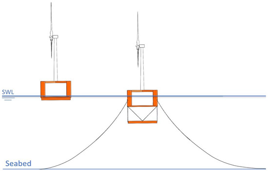 The unique challenge associated with the application of a floating wind turbine is the innovative structural design of the floating foundation to survive and maintain the necessary stability required by wind turbines operated under violent ocean and weather conditions. Although various designs of floating foundations have already been developed, which leads to a countable number of successful pilot projects for offshore wind resource exploitation over deep water areas, the currently mature designs of the floating foundation are mainly applicable for water depths exceeding 100 m. In order to smooth the transition from using the bottom-fixed wind turbine to the floating wind turbine, a floating foundation design targeting water depths in the range of 70~150 m is beneficial since the distance from the shore—and hence the installation and maintenance cost—increases exponentially with the water depth. Although the sea state is milder in intermediate waters, with water depths in the range of 70~150 m, compared to the deep waters [5], the nonlinear effect of waves intensifies and the stability of winds reduces significantly when the water depth decreases, resulting in a more complicated sea environment [6,7]. Furthermore, a higher demand is placed on the design of mooring lines in intermediate water depths, as the layout of catenary mooring lines needs to be expanded to compensate for the loss of restoring forces due to the shortened vertical length. In addition, issues concerning vibration and the structural control of wind turbines also deserve much attention [8,9,10]. Despite its importance and complexity, only a few studies have suggested a conceptual design of a floating foundation applicable for intermediate water depths. Cao et al. [11,12] proposed a 10 MW semisubmersible floating wind turbine for medium water depths with partially tilted-sided columns to increase stability. Both numerical and experimental studies have been carried out to investigate the second-order effect of its dynamic response. Cutler et al. [13] proposed a barge-type catamaran floating wind turbine and confirmed its dynamic behavior in an intermediate water depth of 150 m through numerical simulation. Jiang et al. [5] performed an experimental study of a stepped spar floating wind turbine applied for moderate water depths. The present study constitutes the first attempt of the authors to address such an issue by introducing a new semi-spar-type floating foundation design.