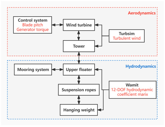 The floating wind turbine is a complicated multi-degree-of-freedom (DOF) system subjected to severe environmental loads, and the motion response of different components interact with each other. How to accurately predict the dynamic performance of each component is of great importance to the investigation of floating wind turbines. In this study, a numerical tool, namely, OrcaFlex version 11.1 [29] is used to perform a fully coupled aero-hydro-servo-elastic analysis for the proposed semi-spar floating wind turbine in the time domain. OrcaFlex is a nonlinear numerical simulation package in the time domain developed by Orcina that is mainly used for static and dynamic response simulations of offshore structures. Moreover, OrcaFlex is capable of simulating the rotating wind turbine under operation conditions and the dynamics of multi-floating bodies. In the OrcaFlex simulation, the aerodynamics of wind turbines and towers, the hydrodynamics of floating platforms and mooring lines, the control over the blade pitch angle and rotor torque, and the elastic deformation of towers, blades, mooring lines, and suspension ropes are all taken into account, and the response to each part is solved subsequently in the simulation time steps. Figure 6 shows the flow chart of the numerical simulation.