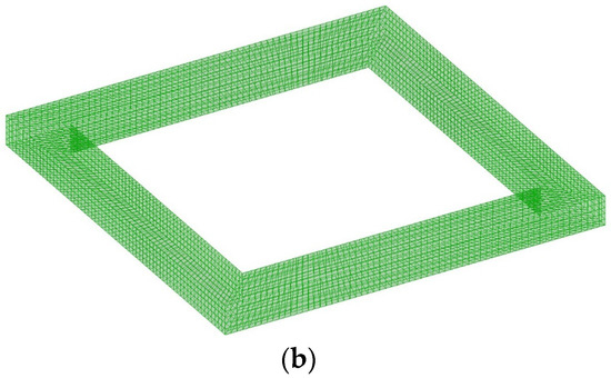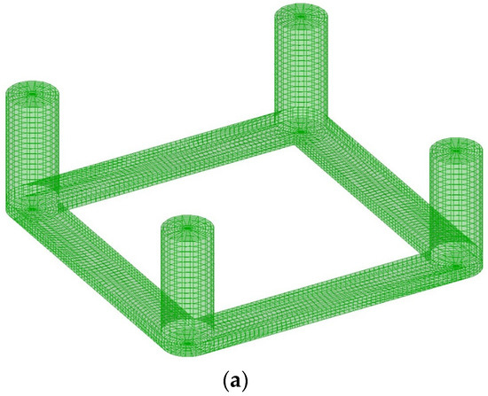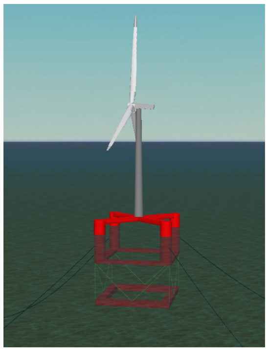 The upper floater is a box-shaped body that consists of four side columns, four pontoons, and a top beam. In detail, the bases of the side columns are connected by four rectangular pontoons, and a cross-shaped beam links the tops of the side columns. The watertight compartments of the pontoons accommodate ballast water. The tower is mounted on the center of the cross-shaped beam. The draft of the upper floater is designed to be 20 m. Located beneath the upper floater, the hanging weight is a square-shaped ring, with concrete and seawater ballast filled inside. The ring is positioned at 50 m beneath the sea level to lower the center of gravity for the entire floating wind turbine. The geometric design of the platform is illustrated in Figure 3, and the main parameters are listed in Table 2. The large cross-section of the pontoon and counterweight highly increases the added mass of the substructure for translations in the vertical direction. In fact, such a configuration plays a similar role as the heave plate, raising the heave natural period away from the period range of energy-contained waves.