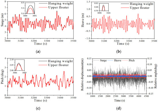 In the numerical simulation, the upper floater and hanging weight are modeled as two independent rigid bodies, and, hence, their motions are not completely synchronized. Figure 9 compares the movement of the upper floater and hanging weight under the load case of EC2 (Figure 9a–c) and shows the relative motion difference between them (Figure 9d). Only minor differences are observed in the motions of the upper floater and the hanging weight. In fact, the differences in their motions are less than 0.2 m for the surge, 0.025 m for the heave, and 0.05 deg for the pitch. This indicates that the two bodies are closely connected and that their motion difference can be neglected. Consequently, the focus of this study is on the movement of the upper floating body, where the wind turbine is installed. Unless otherwise specified, the motion of the upper floater is referred to as the motion of the entire floating platform in the following discussion.