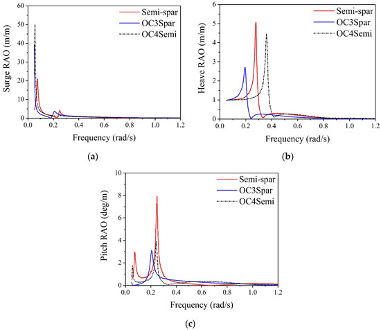 Comparison of RAOs between semi-spar, OC3-spar, and OC4-semisubmersible: (a) surge; (b) heave; (c) pitch.