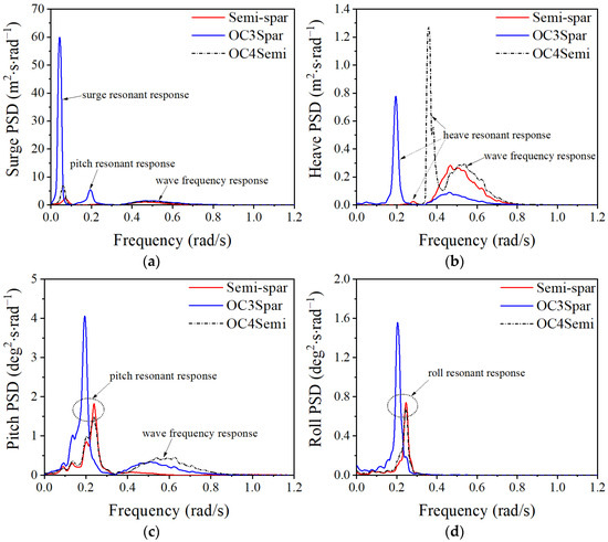 Power spectral density of platform motion under EC2: (a) surge; (b) heave; (c) pitch; (d) roll.