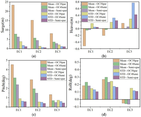 Subsequently, a statistical comparison of the hydrodynamic performance is given in Figure 13. It can be observed that the proposed semi-spar has a minimum mean and standard deviation of surge and pitch motion responses under all the load cases. More specifically, Figure 13 shows more than 50% and 30% reductions in surge and pitch responses, respectively, of the proposed semi-spar platform compared to the OC3-spar platform. The stability of the proposed semi-spar type in the surge direction is mainly attributed to the well-designed mooring system, while the small mean pitch angle is in association with the large waterplane moment of inertia. In fact, the mean pitch angle of the proposed semi-spar design does not exceed 3° under all load conditions. Moreover, it can also be found that the mean value of the surge and pitch becomes smaller from the load case of EC1 to EC3, while the standard deviation does not share the same trend. Moreover, the standard deviation of the semi-spar design in heave motions lies between the boundaries corresponding to the OC3-spar and OC4-semisubmersible platform. As for the roll motion, despite the small dynamic response, it can still be seen that the standard deviation of the semi-spar’s motion response is the smallest among the three floating wind turbines.