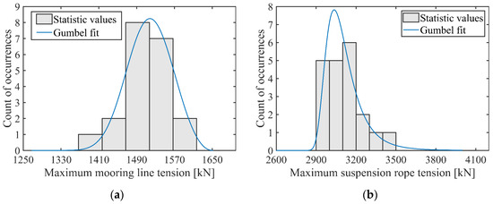 Gumbel fit of the maximum mooring line and suspension rope tension: (a) mooring line #2; (b) suspension rope #6.